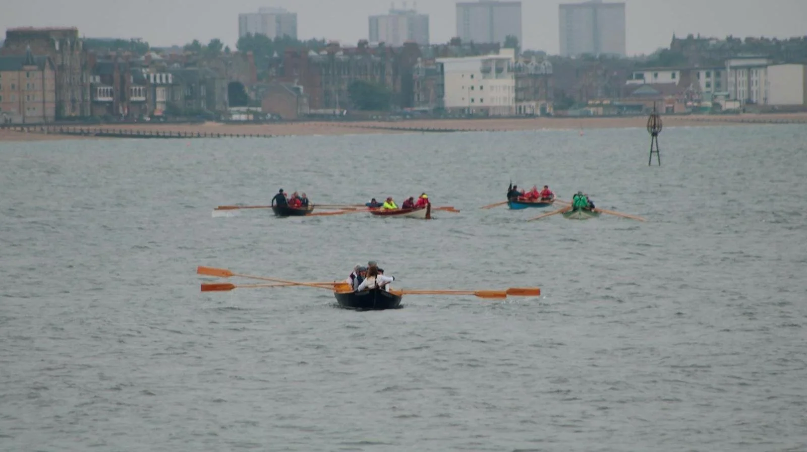 We launch the boats into Fisherrow Harbour and wave off the land team, who are cycling the coast to Port Seton along the John Muir Way. We get a brief glimpse back to Portobello and Leith before turning eastwards and heading along the seafront. The sea is sparkling and we’ve got a warm westerly breeze behind us.